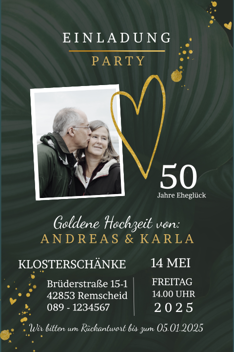 Hochzeitstag weil die goldene hochzeit eben so ein besonderer tag ist möchte man dem ehepaar auch etwas ganz besonderes schenken. Glückwünsche zur goldenen hochzeit können also auch gern in eine goldene karte geschrieben oder mit gold verziert werden. Das persönliche geschenk zur goldenen hochzeit mit verschiedenen goldhochzeitsmotiven individuell gefertigte wanduhr mit passendem motiv zur goldhochzeit beschriftet mit den namen dem hochzeitsdatum und einem spruch zur goldenen hochzeit. Goldene hochzeit heute feiert ihr als zeugen sind wir hier. Goldene hochzeit geschenk uhr individuell mit namen der eheleute. Wir wünschen euch viel spaß dabei und hoffen dass ihr auch weiterhin so zufrieden gesund und glücklich bleibt. Die goldfarbige wanduhr mit dem durchmesser von 30 cm gestalten wir mit ihren eigenen fotos passend zur goldhochzeit.