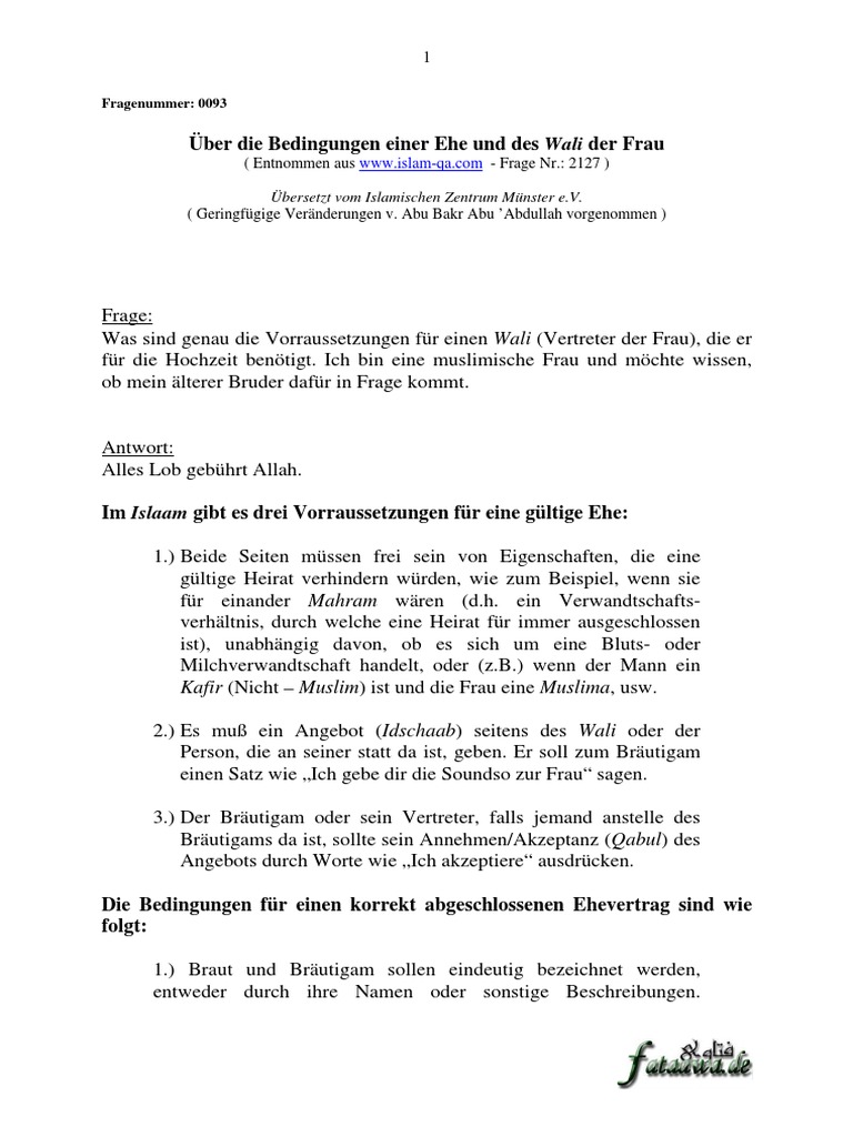 Außerdem gelten diese weiteren bedingungen. Fatawa von den großgelehrten der muslimischen welt. Im islam ist es abgesehen vom wali mudschbir verboten frauen gegen ihren willen zu verheiraten. Die ehe ist der einzige ort in dem diese trennung legitimerweise aufgehoben ist. Und die standesamtliche trauung ist ein gesetzliches verfahren. Dann ist eine heirat im islam nur möglich wenn der mann den muslimischen glauben annimmt. Islamische rechtsurteile nach quran und sunnah.